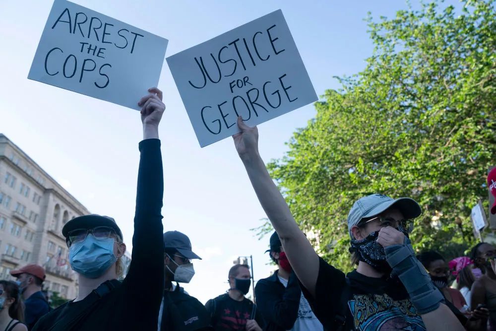 5月31日,在美国首都华盛顿,人们手举标语在白宫前参加抗议。新华社记者 刘杰 摄