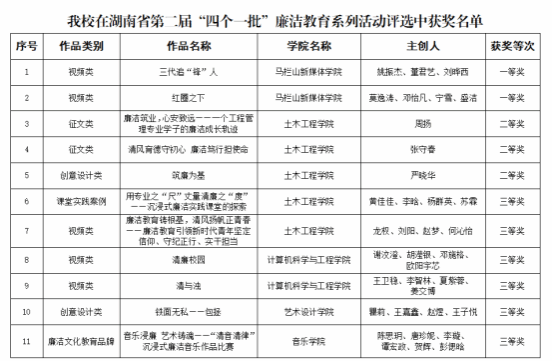近日,湖南省第二届 “四个一批” 廉洁教育系列活动评选结果正式公布,我校选送的11个作品在众多参评作品中脱颖而出,喜获一等奖 2 项、二等奖 3 项、三等奖 6 项,获奖数量创历史新高,位居全省高校第三。获奖类别广泛覆盖征文、视频、创意设计、课堂实践案例、廉洁文化教育品牌等五个领域,充分展现了我校在清廉校园建设方面的深厚积淀与丰硕成果,以及“清润长大”的浓厚廉洁文化氛围。